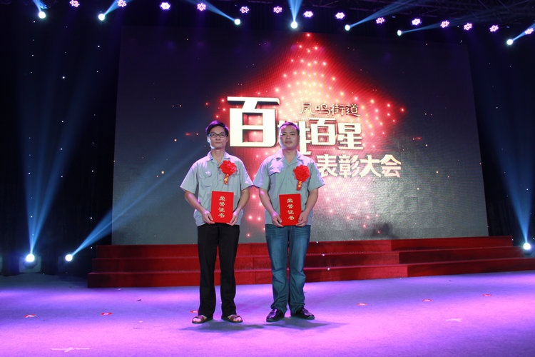 7月30日上午,,,,,,,凤鸣街道在影剧院隆重举行“百姓百星”表彰大会,,,,,,,授予经推荐、评选、审定、公示等环节产生的85位同志为“百姓百星”称号,,,,,,,桐乡市委书记卢跃东、副书记蒋惠玲,,,,,,,市委常委、常务副市长吴炳泉,,,,,,,市委常委、宣传部长沈建坤,,,,,,,政协副主席孙晓东等领导向“百姓百星”颁发荣誉证书。。。。。。437必赢公司姚卫良、徐学明两同志荣获“百姓百星”称号,,,,,,,会上受到表彰。。。。。。