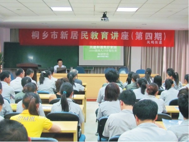 5月16日下午,,,,,,,凤鸣街道在我公司举办新居民教育讲座。。。。。桐乡市新居民事务管理局的有关同志给公司80余名员工就新居民计划生育政策进行了讲课,,,,,,,使新居民员工得到了一次政策服务。。。。。